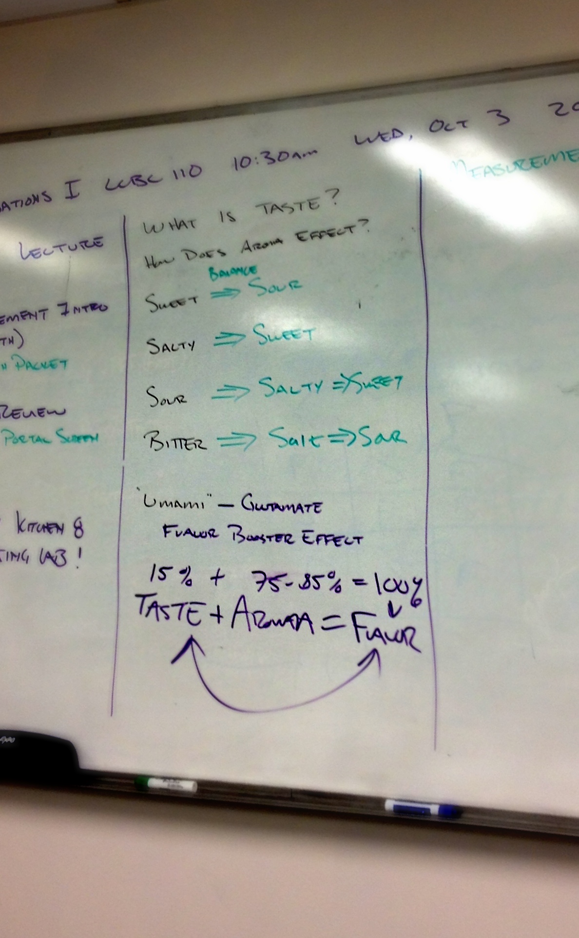 I won’t get into the sanitation stuff we’re learning as it will freak most of you out, especially my lovely risk manager. But we are also learning about taste. Not only the five flavors you taste, but how they molecularly affect you. –Salty, sweet, sour, bitter, and umami (savory).