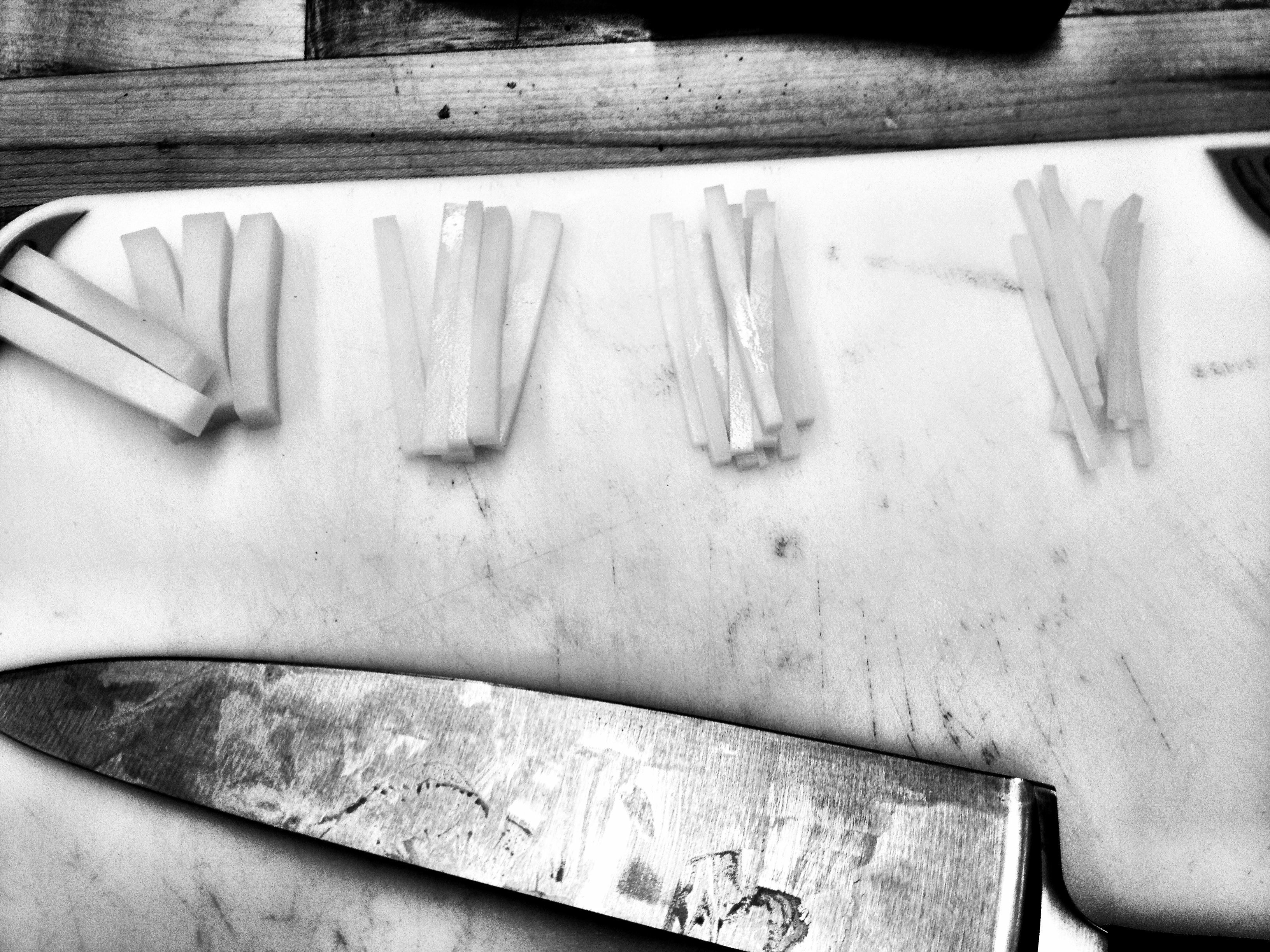 Mmmmm and knife skills. AWESOME. Here this is how you chop things, and here are a shit ton of free potatoes to practice on. Ever seen an OCD person learning knife skills? It’s like watching a pregnant woman find lint in her belly button. I’d image both are very amusing to watch 😉